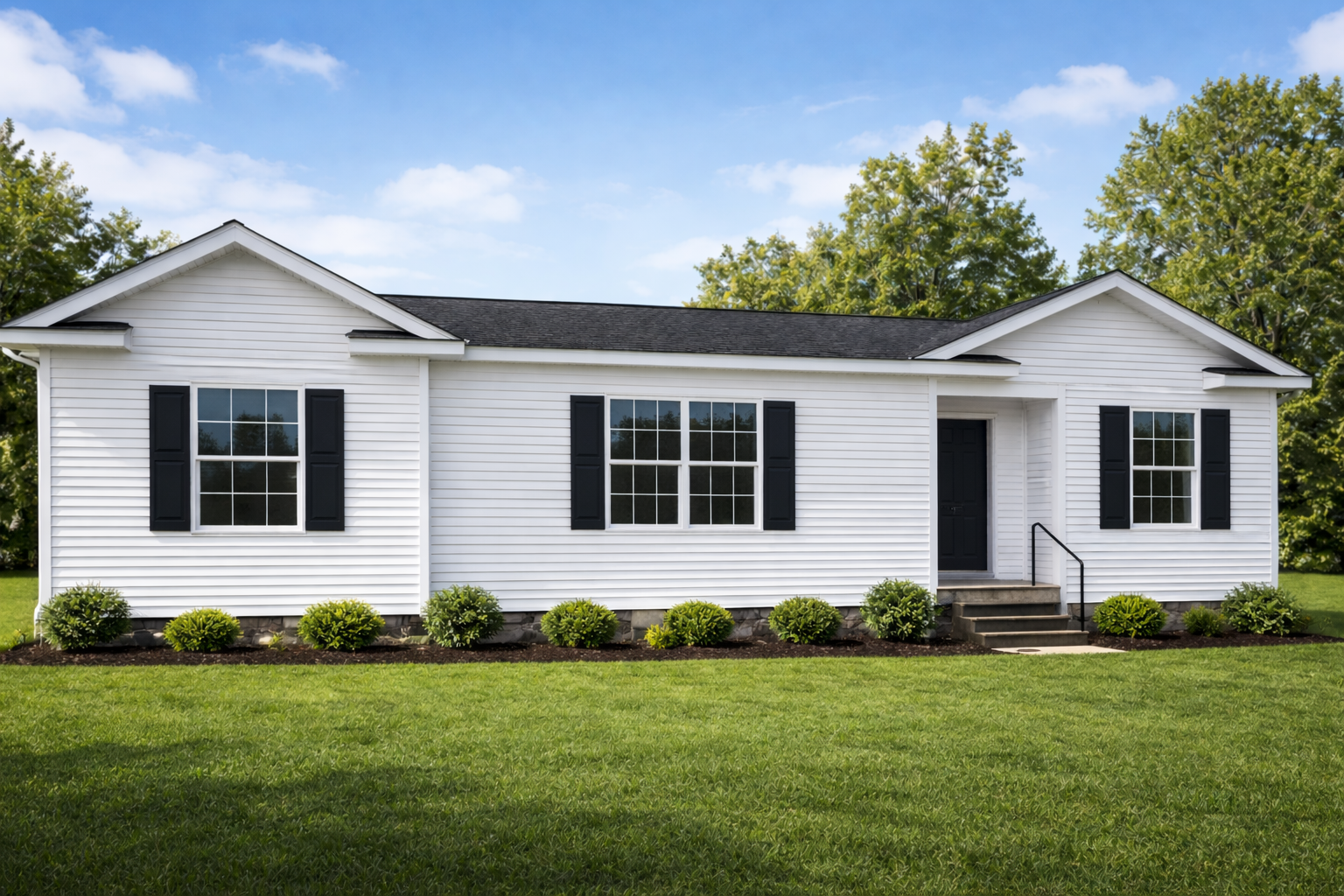 Single story white ranch modular home exterior with black shutters in Western New York