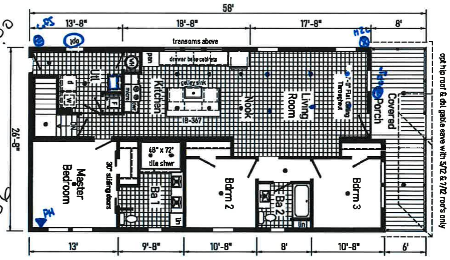L4 modular home floor plan 3 bedroom 2 bathroom 1624 square feet covered porch tile shower Owl Homes of Fredonia
